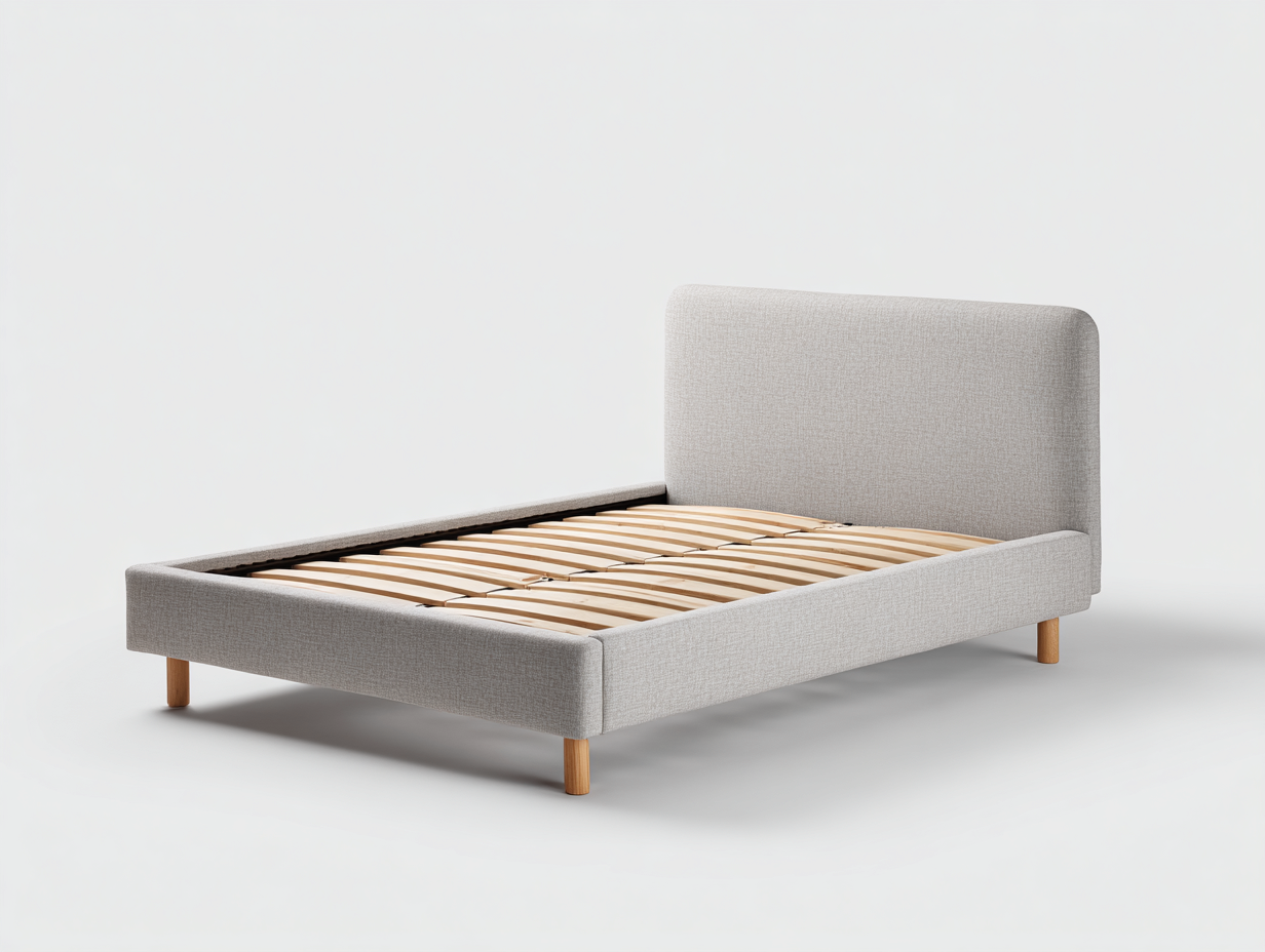 Cadre recouvert de tissu rembourré de couleur gris clair avec une texture agréable au toucher. Les pieds en bois assurent une bonne stabilité et apportent une finition naturelle.